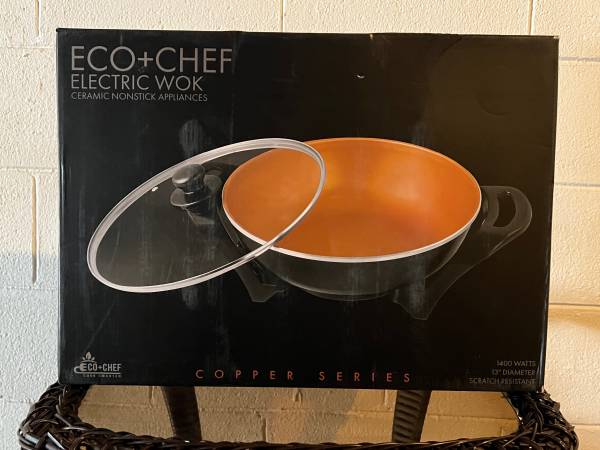 Brand new and in the box. Never opened and never used. A great buy!! Eco+Chef Electric Wok 13” diameter Copper/Non-Stick 1400 watts