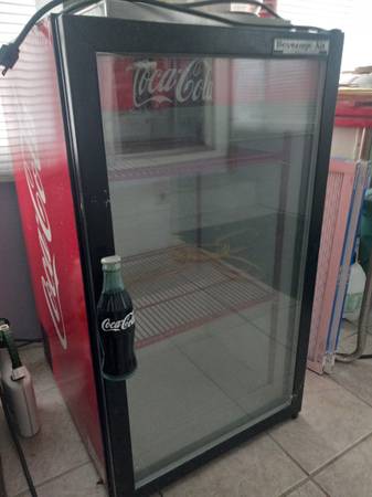Cokea cola fridge. 2 feet 11 inches tall. Glass see through door. The guy that I bought it from took time to paint the inside shelves red. The compressor comes on, but does not cool. I'm guessing that it needs freon. I Don't want to mess around with it. These fridges sell $200 - $300 easily. Good day. I'll plug it in to show you the compressor and the fan working. Good day!