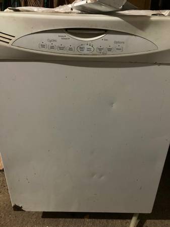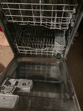 Stainless tub. Rust on bottom left of front. Small dents. Worked okay if items rinsed first. Would rather not put it out on the curb for trash.