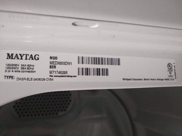 Maytag electric dryer model MEDX655DW1 s/n M71748295 sorry no delivery available. text or email to see it. thanks
