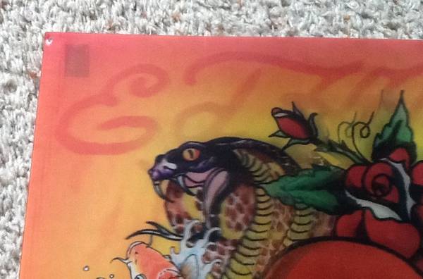 This stunning three dimensional (design moves when you move side to side. Very cool effect.) hard plastic poster/sign is in excellent condition. There is a single pinhole on each corner and a minor corner tip bend on the lower right corner. It measures exactly 26.5 by 18.5 inches and is ready for framing.