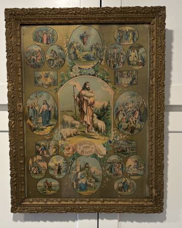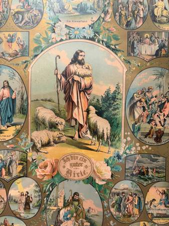 This beautiful print is in German and named "ich bin ein guter hirte" (I am the good shepherd). The frame measures 21.5 by 16.5 and is in good condition for its age. Call or text me at (585) five...