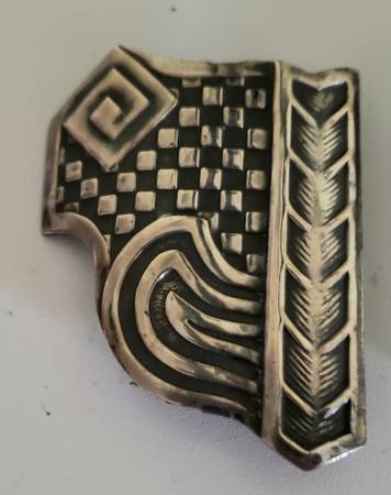 It is hallmarked "Patented 12.15.08" on the back of the buckle. This belt buckle is a brushed and shiny silver tone metal alloy. I found no makers hallmarks on this piece. It measures at 2" in height by 3" in width. This piece will fit a standard 1 5/8 inch wide belt.