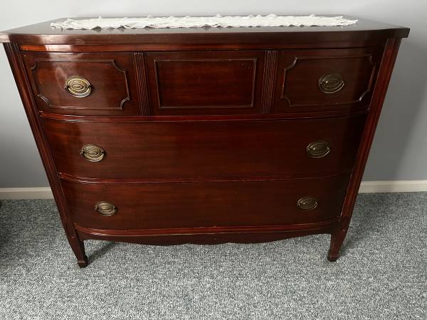 Double bed with fairly new Sterns and Foster mattress, always used with a washable topper; women's and men's dressers and one night stand. Price is negotiable.