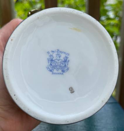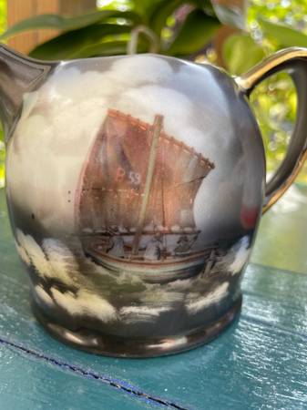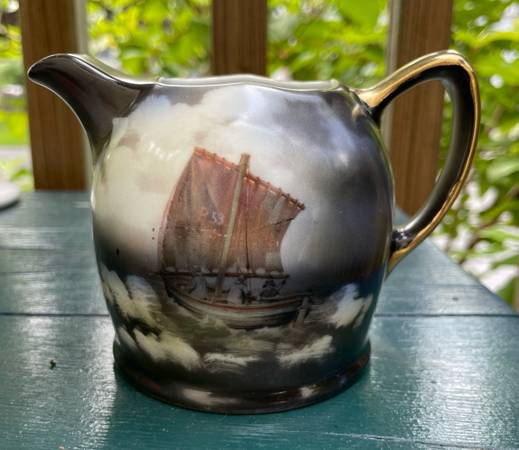 Beautiful hand painted “Boat with Stormy Sky” scene with no chips. China made in Bavaria with gold rim and handles. The base measures 3 inches, 3 1/4” high, 11 inches around.