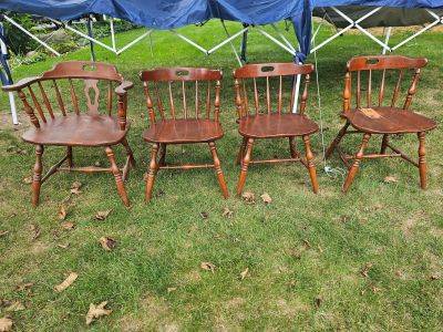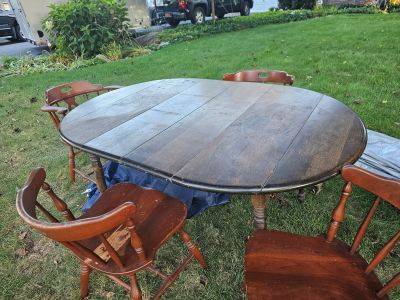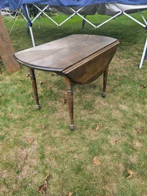 Solid Cherry Table opens to 63", 2 leaf inserts and drop down side with & 4 chairs. This table can be used in a small area or a large area when needed. $95.00 ....This is a great for a family or use it a small area. Drop Leaf , Round or Oval.