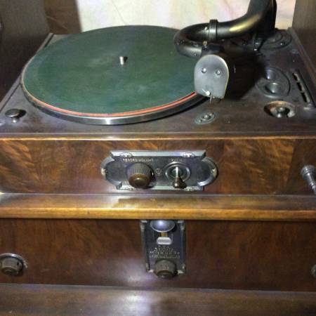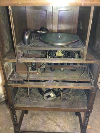 This is an early (1928) radio-phonograph combination made by RCA Victor. It has a very early, electronically-amplified 78 rpm phonograph paired with an RCA Radiola 18. This radio had advanced TRF that was tuned with a single knob. The radio and amplifier have 7 tubes plus I have one extra tube - UY-227. The tubes light up and the set produces hum but no audio from either the radio or the phonograph. The phonograph has an electromagnetic pickup and a very unusual motor that is integral with the turntable rather than the typical motor/idler drive.