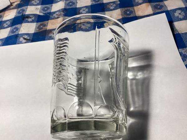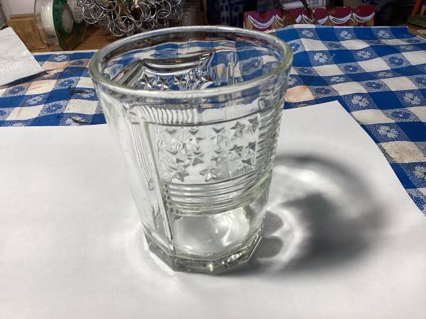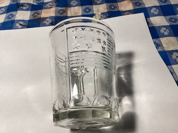 Early beverage glass , ground pontil, depicting a hatchet, musket, 13 star flag and five star shield . No chips, or damage. The glass has a ring to it .