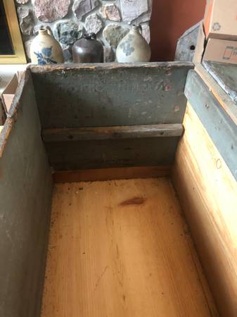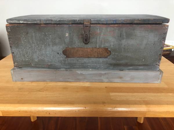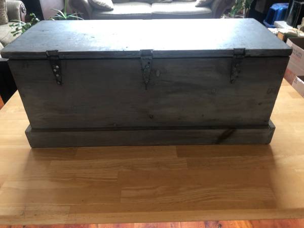Interesting piece: Looks to be an old Vacuum Oil Company crate that quite some years ago was turned into a Trunk /Footlocker with a hinged top..... Has that rustic/primitive look and patina to it. 28" length, 12" height, 12" depth. Brass nameplate on front. Has side handles and a hinged top. Inside sideboards are labeled Vacuum Oil Company, New York, USA
