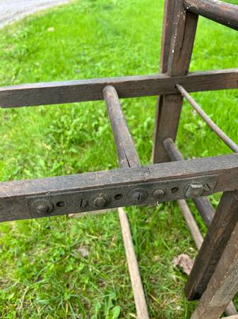 Wooden hose reel with great character and repurpose potential. Great steal wheels.