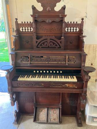 This is a work pump organ! Over 130 years old. The wood is beautiful, could be an absolute museum piece with some work. I don't want it damaged and it needs a home. Come look and make an offer, it needs a good home. It was left behind in a house purchase. Only one I could find like is in Geogia and they want over a grand.