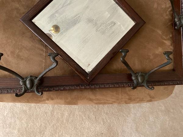 This antique oak framed beveled hall mirror with hat hooks is a stunning piece that will add a touch of elegance to any room. The mirror has a mirrored frame finish and is made of high-quality oak frame material. The item height, length, and width are carefully crafted to ensure the perfect size for any space. This framed mirror is an excellent addition to any antique collection and is perfect for those who appreciate the unique style of the early 1900s. The mirror comes with hat hooks, adding a touch of practicality to its design. It is perfect for use as a decorative piece or a functional mirror, and its quality is sure to impress.