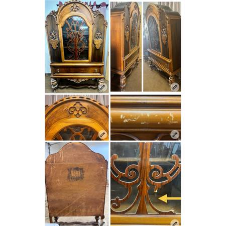 1930 Antique Sideboard, Buffet, China Cabinet Curio. Jacobean Revival Credenza, Hutch. Reaser Furniture. Lrg buffet $150. Sm buffet $100. China cabinet $200.
