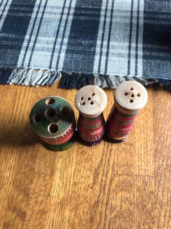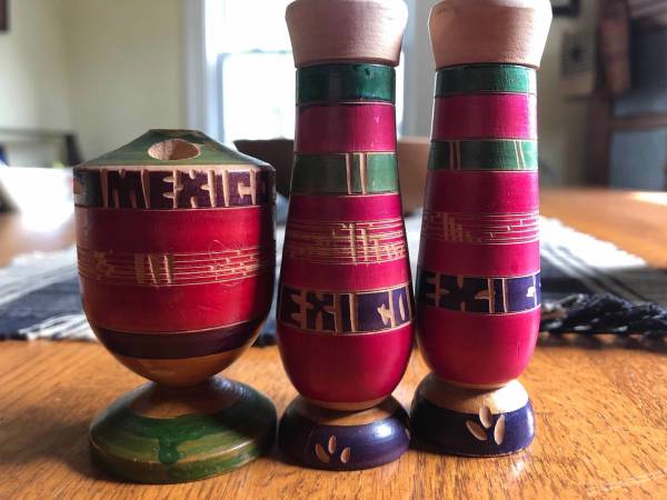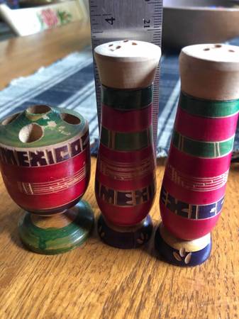 Colorful wooden, handcrafted S and P with the word ‘Mexico’ carved in each piece. I believe the 3rd piece is a toothpick holder. My great-grandmother used these with her Fiesta dinnerware. S and P...