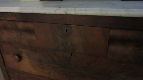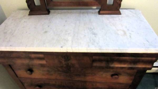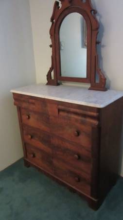 The marble-top dresser has an attached, tilt able mirror which is 30” wide and 35” high.