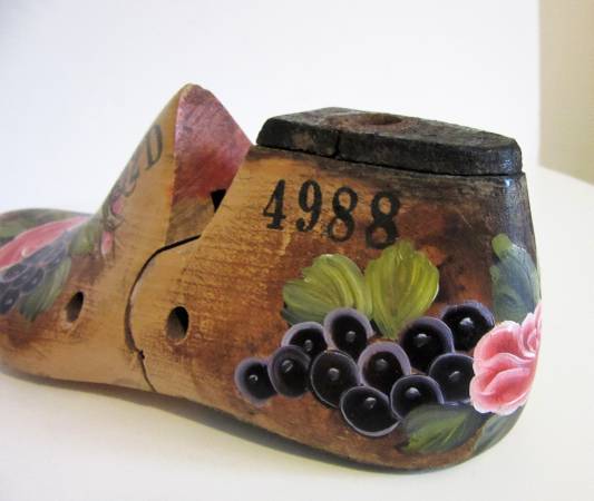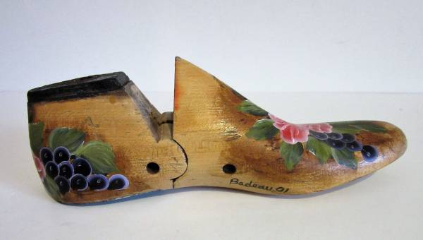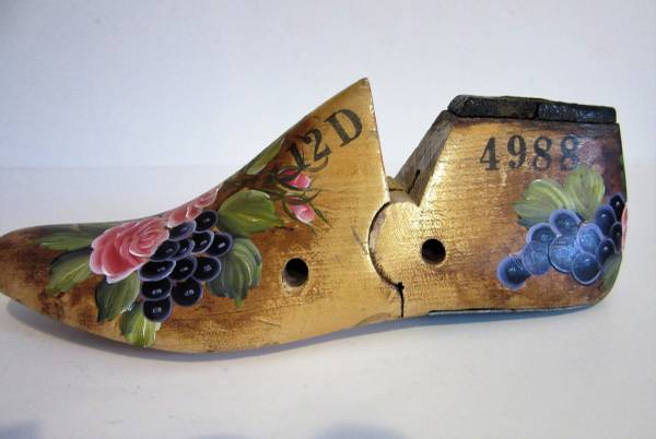 This is an antique wooden shoe last that has been hand painted by Charlotte Badeau, a New York tole painting artist.