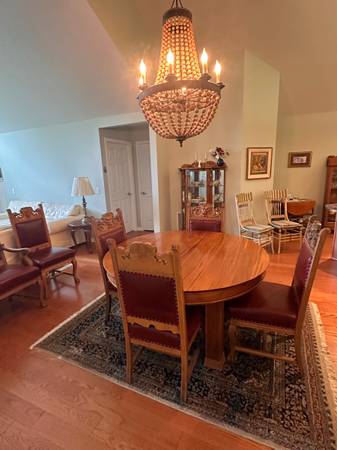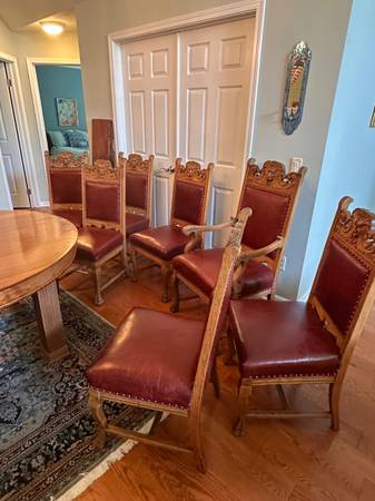 A set of six high-back oak dining room chairs plus one matching arm chair. 7 chairs total.