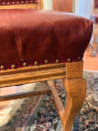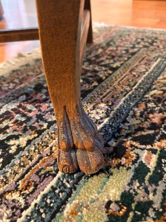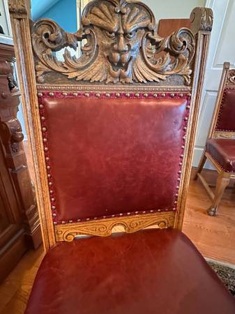 Chairs have a "Northwind Face" or Lion Face in center, leaf ears, claw feet, upholstered back and seat. Side chairs approx. 42 ½" high; arm chair approx. 45" high.