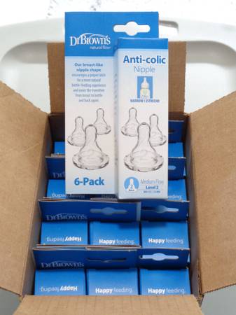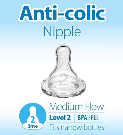 ANTI-COLIC BABY BOTTLE WITH NIPPLE. Level 2 Nipple, with Anti-Colic internal vent system, is clinically proven to reduce colic. Decreases spit-up, burping and gas and provides a more comfortable feeding experience for baby.