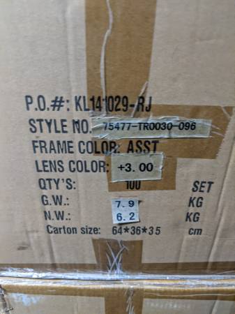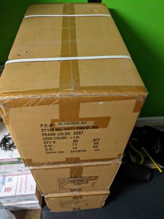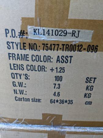 Brand new case. 300 pairs of 1.25 reading glasses. 3 frame colors. Black, brown, and cheetah/jaguar print. Check out the pictures and any questions please ask