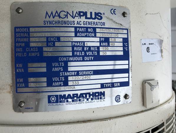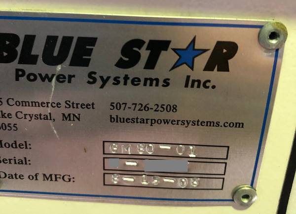 Blue Star 80 KW LP Generator Set w/185 Hours Model: GM80-01 Mfgr. Date: 8-19-08 Standby Rated: 80 KW, 120/240V/60Hz/1Ph., 333 Amps Single Phase Only, 1800 RPM Marathon MagnaPlus Synchronous AC...