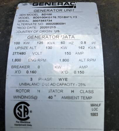 Generac 100 KW Diesel Generator Set (SD100) - New Surplus
