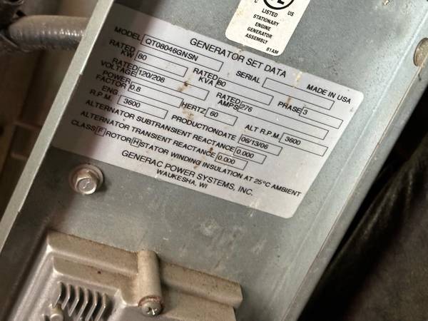 Generac 80 KW Natural Gas Generator Set with 356 HOURS! Sound Attenuated Weatherproof Enclosure Model: QT08046GNSN Production Date: 06/13/06 Standby Rated: 80 KW (80 KVA) Volts: 120/208 , Hz: 60,...