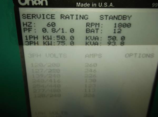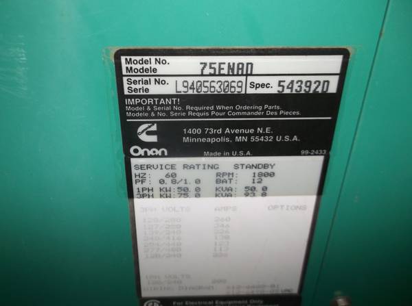 Cummins Onan 75 KW Natural Gas Generator Set w/610 Hours Weatherproof Enclosure with Top-Mounted Muffler Model: 75ENAD, S/N: L940563069, Spec: 543920 Service Rating: Standby, Hz: 60, RPM: 1800, Bat:...