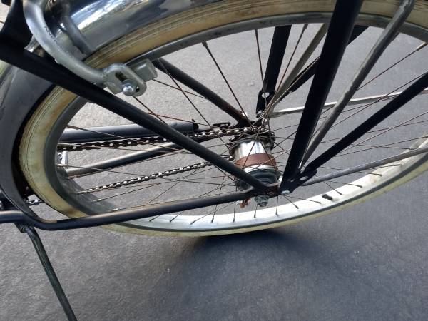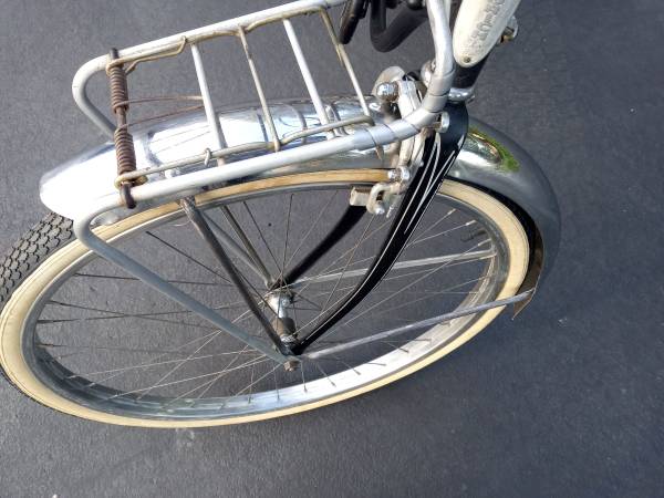 1955 Schwinn Corvette 26" boys bicycle. B.F. GOODRICH HEAD badge , Sold in tire stores in the 50s. Original black paint and decals. 3 speed, new tires, 3 spring Troxel seat, added rear Black Phantom rack . Vintage saddle bags 1950s .All bearings cleaned and lubed. ,Rides great smooth and has the 3 speed rear hub. $700 or RO For sale if posted.