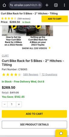 Essentially a brand new bike rack - was used twice to carry bikes behind my camper when I was hauling it with a SUV. Over last winter, I upgraded to a pickup and we no longer need the rack.