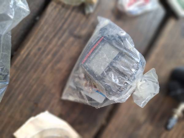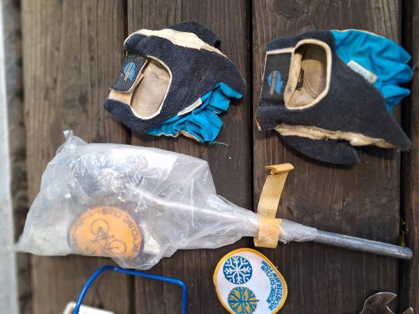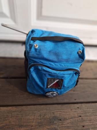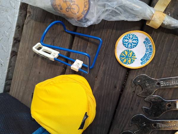 Cannondale Bicycle bag full of bicycle tubes 700x23 - 27" tools, wrenches, spoke tightener, gloves, kickstand, some old vintage bike patches, Electric handlebar gauge and some kind of brackets in bags? I'm not sure what those brackets are used for if somebody knows let me know?