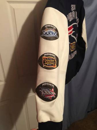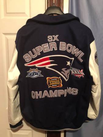 New England Patriots LG Brand New never worn Limited Edition 3X Super Bowl Varsity Jacket with 2 hand pockets on outside and 2 inside pockets, 1 with Zipper and 1 open. Just selling all my football memorabilia. His first 3 rounds of winning super bowls as a rookie very valuable..This is the best looking jacket outta all 6 Super Bowl ones. The others suck compared to this one. Sell for $350 No best offer call only no text no emails I won't respond (Five Eight Five) Five Five Seven - Two Three Two Three Ask for Mike