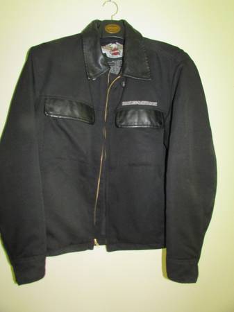 Vintage, unique men's Harley Davidson nylon / leather shell jacket in a size large. Has cotton interior with some poly insulation. It's pretty heavy and could be worn in colder temperatures. Embroidered logo on the back. Has leather front pocket covers that snap and leather collar. Kind of looks like a black Carhartt with the Harley logo on the back. I just had the zipper replaced for $40. Very good shape. I'm in West Irondequoit by the lake. Call or text show contact info