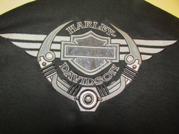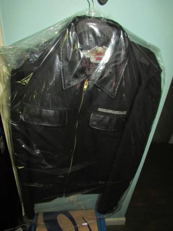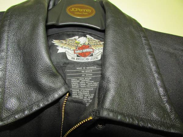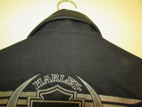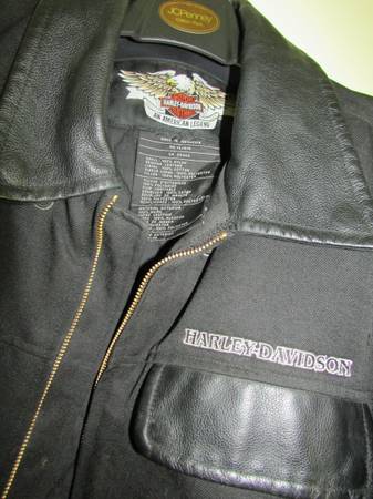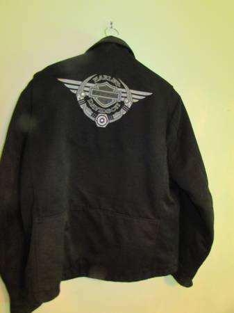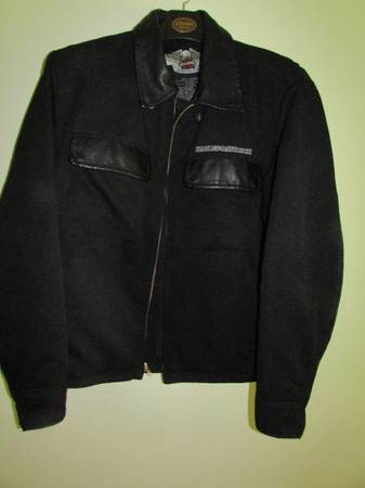 Vintage, unique men's Harley Davidson nylon / leather shell jacket in a size large. Has cotton interior with some poly insulation. It's pretty heavy and could be worn in colder temperatures. Embroidered logo on the back. Has leather front pocket covers that snap and leather collar. Kind of looks like a black Carhartt with the Harley logo on the back. I just had the zipper replaced for $40. Very good shape. I'm in West Irondequoit by the lake. Call or text show contact info