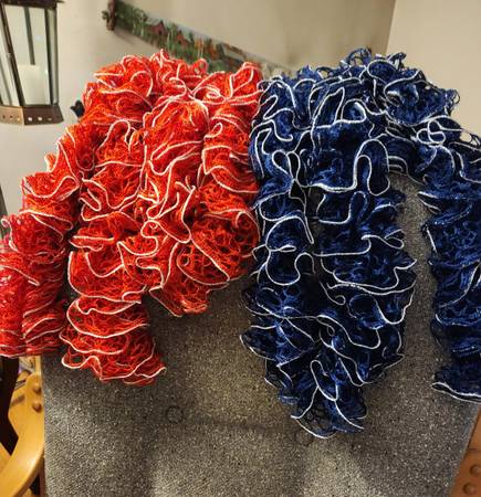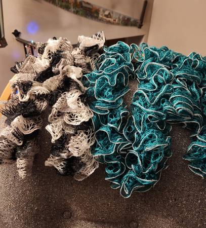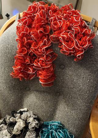 Hand knit ruffled scarf - each approximately 5ft long. $25 each - plus shipping. Specify color - red & silver {2 avl} - navy & silver - green & silver - black/grey/white.
