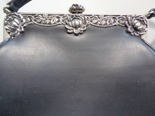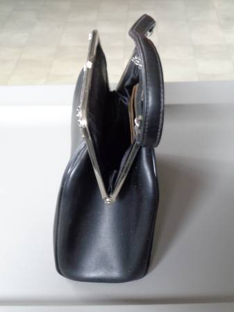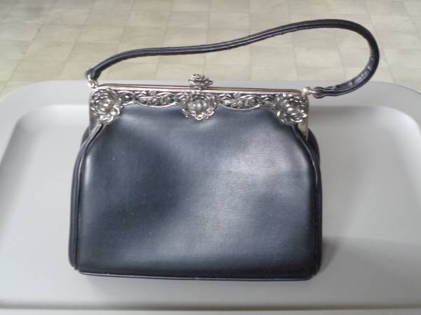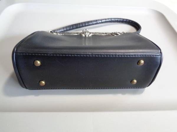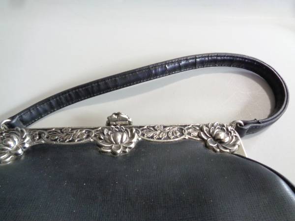 Faux black leather outside with floral trim. Black satin inside with zippered pocket. Sturdy strap. 9" wide x 3.5" deep x 7" tall.