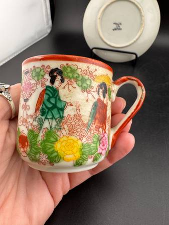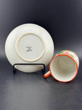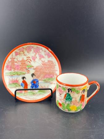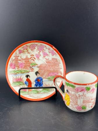 A delicate porcelain tea cup and saucer set featuring traditional Asian-inspired artwork. The design depicts serene scenes with women in colorful kimonos amidst cherry blossoms and pagodas. Perfect for adding a touch of artistry to teatime or as a collectible piece. Saucer 4.25" diameter, cup 2.25" x 3".
