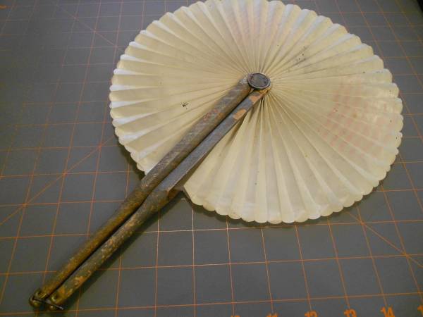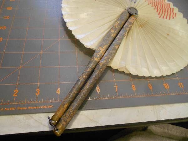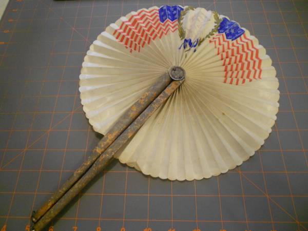 HAND FAN.An accordion-style hand fan, which shows patriotic American flags with an image of Christopher Columbus in the middle of the flags. When open, the fan section opens to about 10" x 10", and with the handle it measures 14.5" in length. There is some light wear to the edges of the paper fan and the handle shows significant wear, but it has held together well. The Columbian Exposition was held to celebrate the 400th anniversary of Christopher Columbus landing in the New World. However, instead of opening in 1892 (the actual anniversary) the fair opened one year later. It ran from May 1-October 31, 1893.