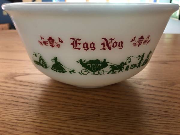 Vintage Hazel Atlas Milk Glass Egg Nog Bowl: 4 1/2" Tall, 9" Wide, 12 Cup capacity, Red lettering, Green design, No chips or scratches, Excellent condition. Just $20.00