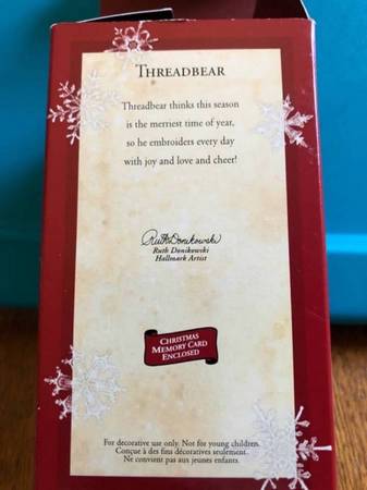 An adorable little “Steiff-like” bear with a spool of thread body, and thimble hat. Perfect gift for a seamstress. From 2002. Never displayed; new in box. Porch pick up near Strong Hospital/UR. Cash.