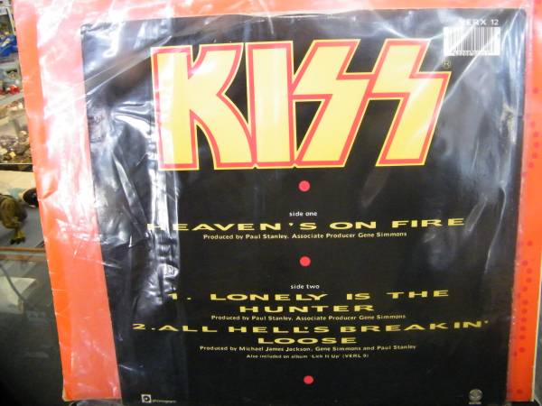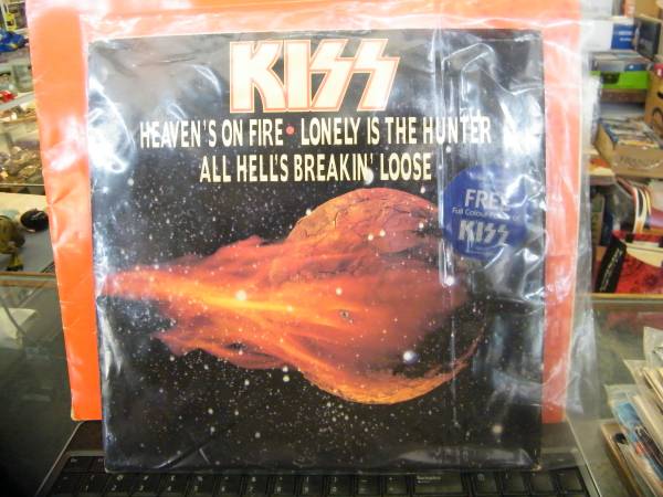 KISS - 12'' 45 RPM RECORD/ POSTER BOTH ECCELLENT CONDITION (HEAVEN'S ON FIRE-LONELY IS THE HUNTER ALL HELL'S BREAKIN' LOOSE) VERX 12 SALE PICE $38.00