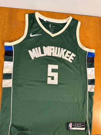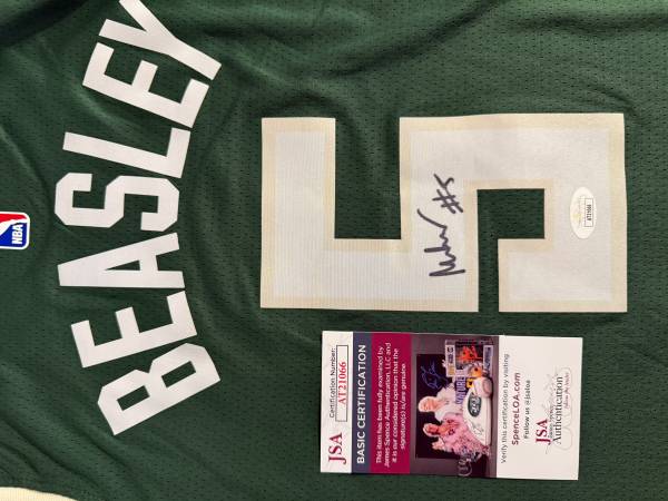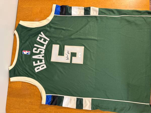 The product is an autographed Malik Beasley Milwaukee Bucks jersey, authenticated by James Spence Authentication (JSA). This authentic NBA sports memorabilia features the athlete's signature and is made with Nike Dri-Fit technology for comfort and durability. The size is large, making it a perfect addition to any basketball fan's collection or a great gift for a Milwaukee Bucks supporter.