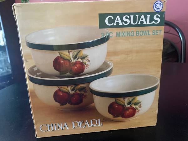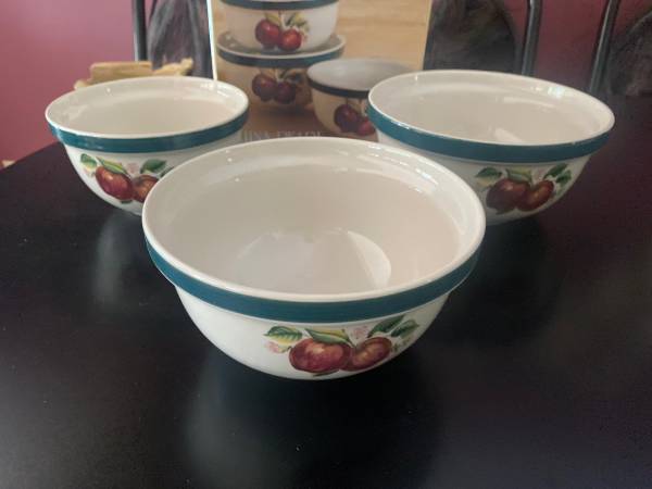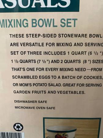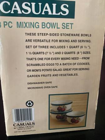 Set of 3 Mixing bowls "apple" Steep sided stoneware Bowls are versatile for mixing and serving 2 Qt, 1.5 Qt, and 1 Qt Great for serving garden fruits and salads Dishwasher safe Microwave oven safe...