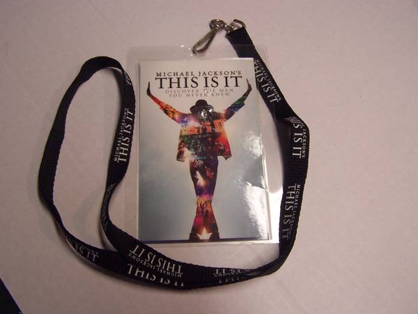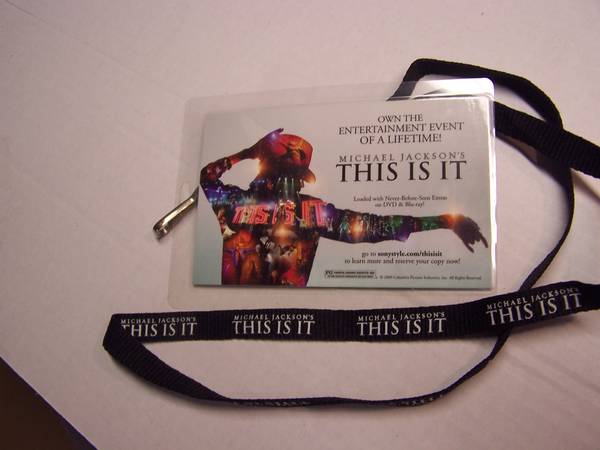 PROMO THE KING OF POP. UP FOR BID IS 1 ONE MICHAEL JACKSON LAMINATED "THIS IS IT" MOVIE PROMO PASS AND LANYARD. YOU HAD TO BE IN ATTENDENCE EARLY AT ONLY SELECT THEATERS IN ORDER TO RECEIVE THIS RARE PROMO.MAY HAVE SOME SMALL HANDEL MARKS. VGC