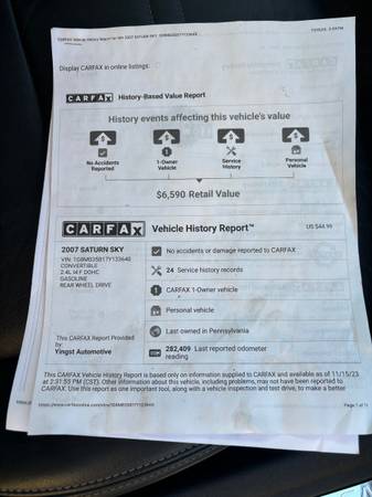 2007 Saturn Sky, 4 cyl non-turbo, 5 speed manual. Starts, runs and rides great! Good tires and brakes. Brand new battery, 282650 miles, I am the second owner. $5800