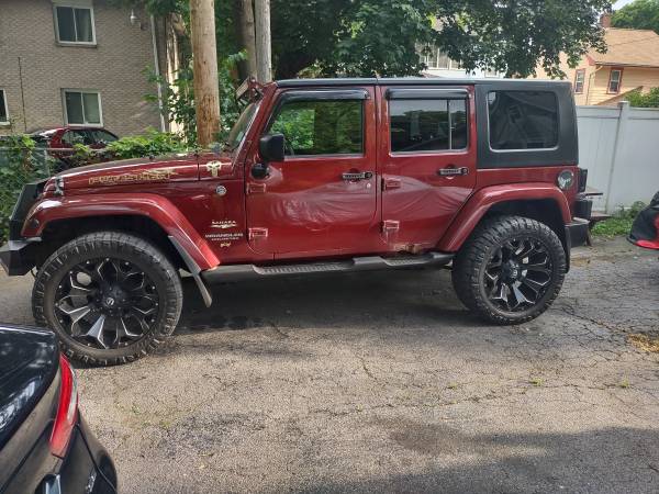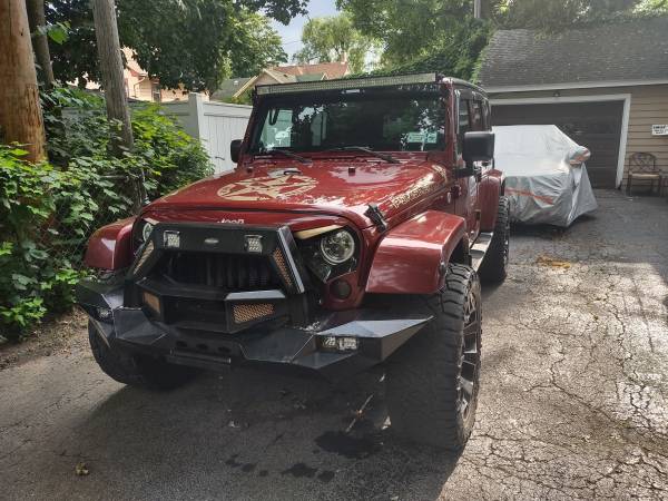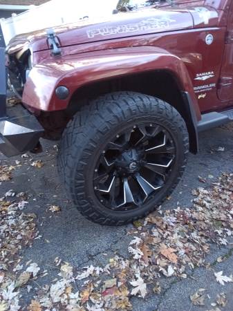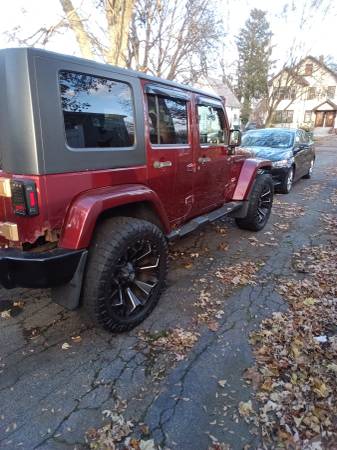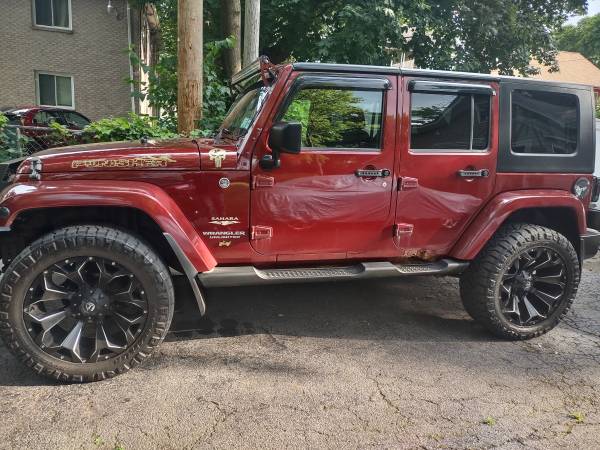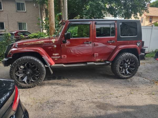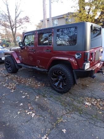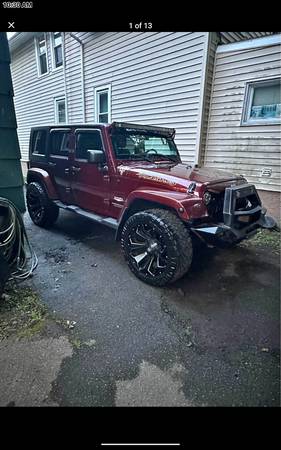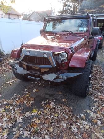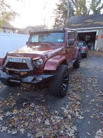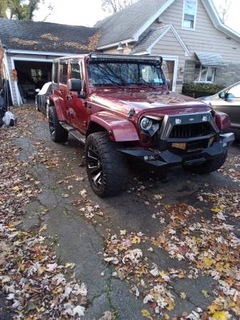 2008 Jeep Wrangler Unlimited Sahara Sport utility four-door, runs very good, A/C (ice cold) heat works excellent, two sets of tires, factory tires are like new, Jeep is raised 2" with custom rims and tires, has custom grill and LED headlights and tail lights, remote start custom bumper with fogs, sound system with amps and navigation, Bluetooth, backup camera, touch screen unit, light bar, does have some rust spots, body solid underneath, removable top and doors, a head turner in the summer 6,800 OBO show contact info