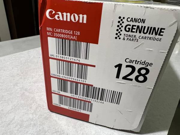 We have for sale a brand new Genuine Canon Cartridge 128 in its original sealed box. It was purchased recently from a major retail store. (See pictures.) 1) Intended for: Canon ImageClass MF4400,...
