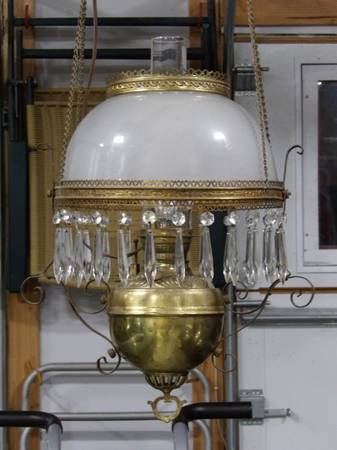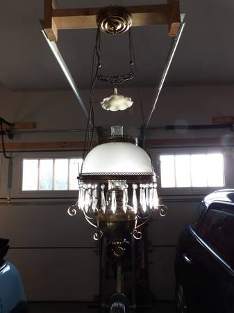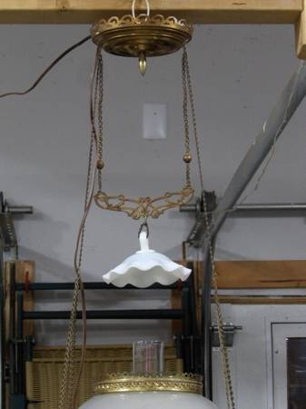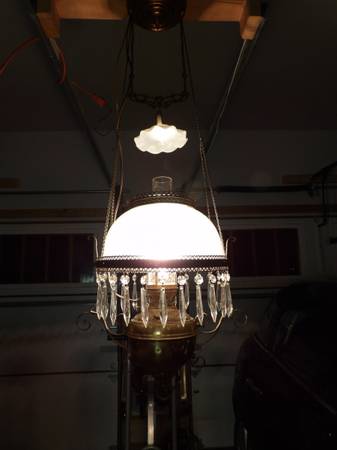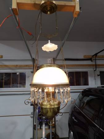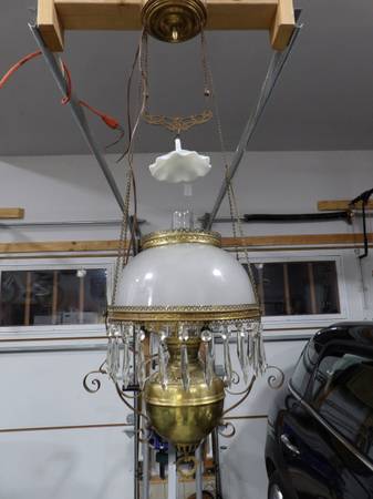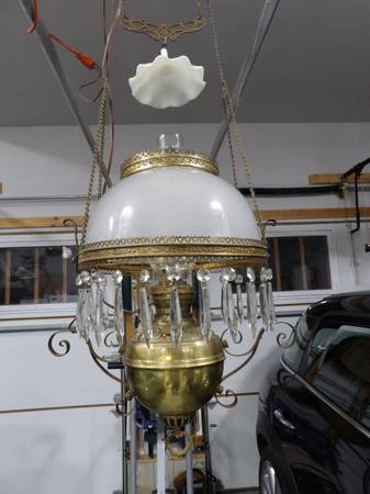 For sale is this very nice electrified antique pendent light, originally operated with lamp oil. It is brass with a white smoke bell and large white shade, and can be used with the prisms on or off the shade frame. It measures 40” from the top of the canopy to the bottom of the light frame. However, it be adjusted by shortening the chain. The width of the shade frame is 12” and the total width of the light frame is 16”. Should you have any question, do not hesitate to contact me.