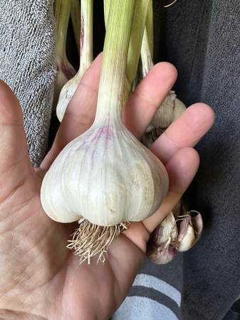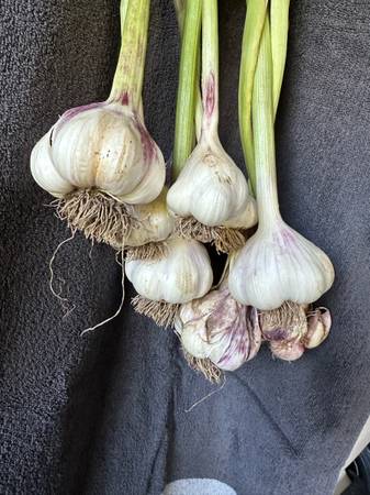 Freshly pulled garlic. No pesticides added only compost. Soft and Hardneck varieties available. Table and seed available. Table is a bit smaller in size used for cooking. Seed garlic are larger heads used for planting to produce beautiful heads next year. Table $1 per head and Seed $1.25 per head. Place your order soon. Available but selling quickly…