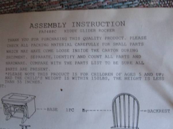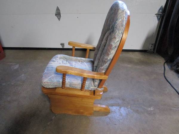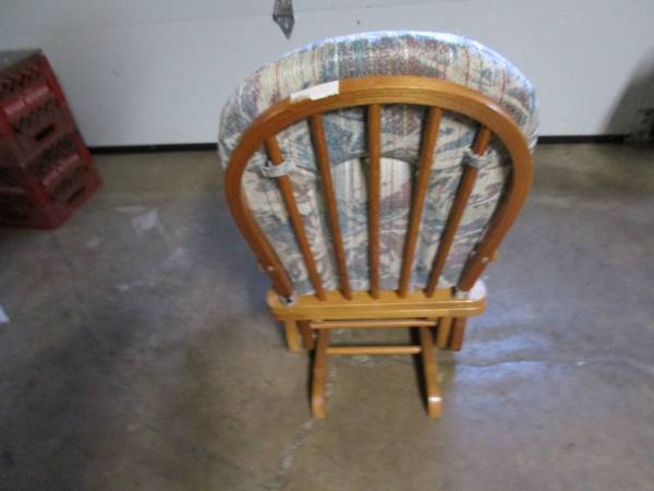 Wooden Glider/Rocking Chair in new condition. For youths 5+ in age and up to 150 lbs. Chair cushions -like new Chair glides easy and quietly. Overall size= 32" high x 18" wide x 22" deep. CASH ONLY